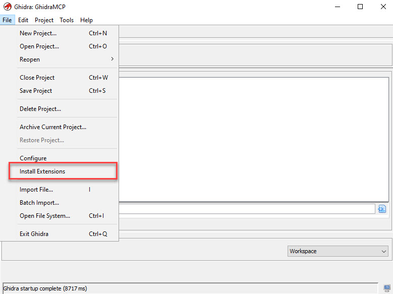 Nu gaan we de GhidraMCP plugin installeren in Ghidra. Hiervoor openen we Ghidra en kiezen we voor “File” – “Install Extensions”: