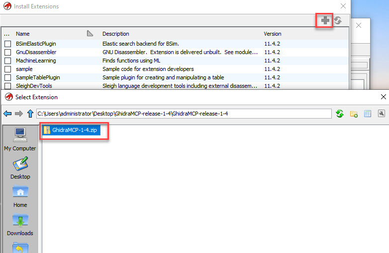 Vervolgens klik je op het + icoontje. In het volgende venster selecteer je de GhidraMCP plugin (pak hiervoor de ZIP uit die je vanuit de releases pagina gedownload hebt):