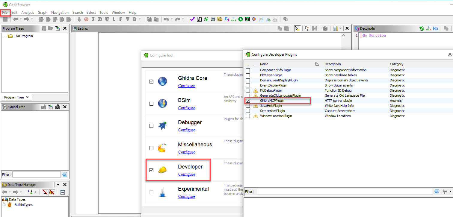 Nu moeten we Ghidra rebooten, een project starten en controleren of onder “File” – “Configure” de “Developer” optie is geselecteed en of hier de GhidraMCP plugin actief is. We kunnen hier eventueel via “Edit” – “Tool Options” de poort configureren.