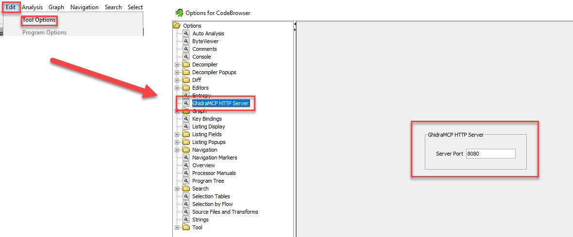 - Configureer de poort in Ghidra’s Tool Options.