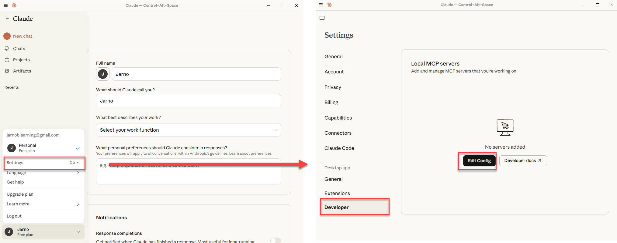 Nu dat gedaan is openen we Claude Desktop en gaan we naar “Settings” – “Developer” – “Edit Config”.