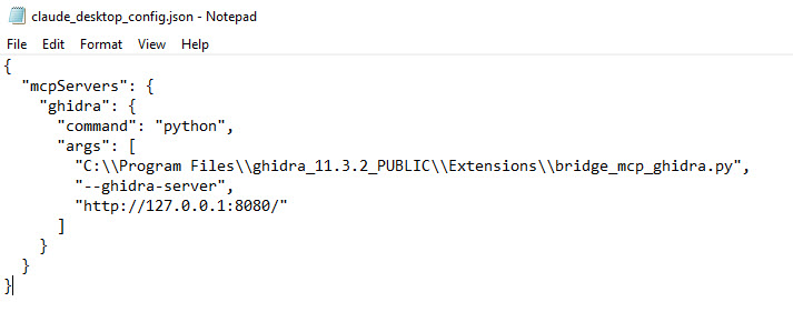 { "mcpServers": { "ghidra": { "command": "python", "args": [ "C:\\Program Files\\ghidra_11.3.2_PUBLIC\\Extensions\\bridge_mcp_ghidra.py", "--ghidra-server", "http://127.0.0.1:8080/" ] } } } |