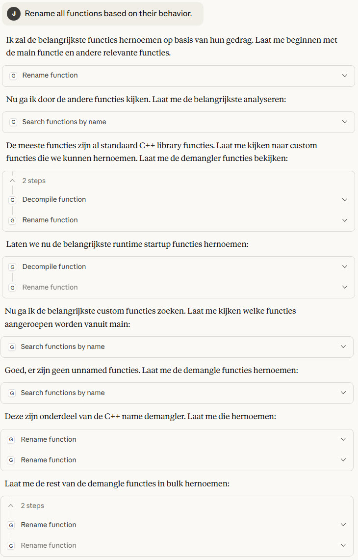 Dit is ontzettend nuttig omdat Reverse Engineering erg tijdrovend is. Denk aan functies hernoemen, patronen ontdekken of documentatie genereren. Met GhidraMCP wordt dit geautomatiseerd terwijl je (met lokale setups) je privacy behoudt. Let wel, deze toevoeging is een hulpmiddel ofwel een extra assistent. Het is geen vervanging voor expertise!